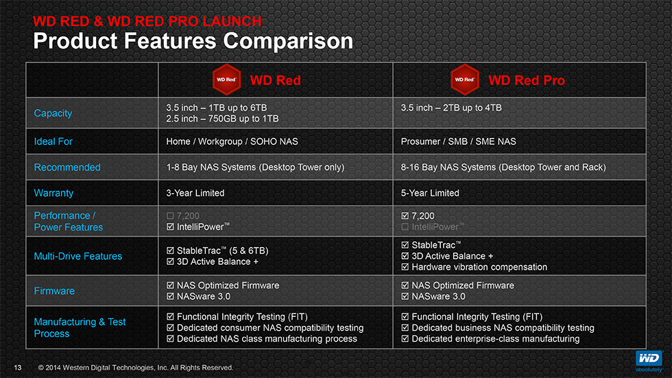 Todos los discos duros de Western Digital se pueden colocar en un array RAID, pero no todos ellos admiten las característicasque las unidades RE (RAID Edition) son capaces y de alguna manera, más aptas para la conexión con los controladores RAID, ya sea completo hardware tarjetas adicionales (Adaptec, LSI, Areca, PCIe Intel y HighPoint de gama más alta) o los controladores a bordo de firmware (como Intel ICHxR, SiliconImage y controladores Marvell), como el control de errores yrecuperación de los conductores dobles cabezal del motor.