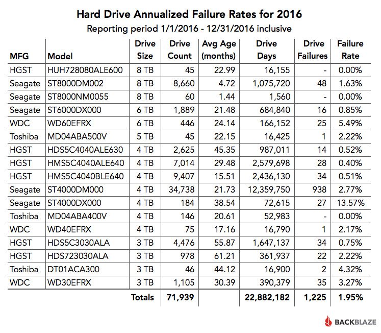 Los datos recogidos por Backblaze a lo largo de 2016 tienen como en ocasiones anteriores claros triunfadores y perdedores. HGST (antiguamente Hitachi) sigue siendo de largo el fabricante de discos duros más fiable según los datos de la compañía, con una tasa de fallos de tan solo el 0,60%. En el extremo opuesto se encuentra WD, que con un menor número de unidades y horas de uso registra una tasa de averías del 3,88%. En medio se sitúan Toshiba y Seagate, con un 2,65% y 1,27% de incidencias a lo largo de 2016, respectivamente.